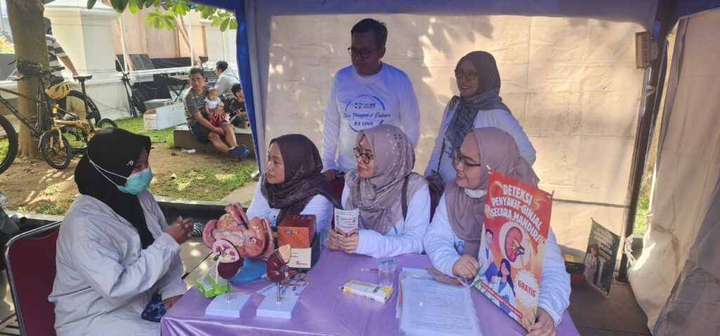 Screening atau deteksi dini adanya penyakit gagal ginjal kronis juga dilakukan dengan membagikan quisioner untuk screening dini penyakit ginjal, dimana hasil penilaian screening bisa diinterpretasikan apakah seseorang mempunyai risiko lebih tinggi ataukah lebuh rendah untuk menderita penyakit ginjal. “Ada sekitar 70-an peserta dari masyakarat yang telah dilakukan screening, konsultasi dan pemeriksaan oleh 8 internist dari RS UNS. Kami juga membagikan leaflet tentang penyakit ginjal kronis dan cara menjaga kesehatan ginjal. Kami sangat senang animo dan antusias masyarakat mendatangi booth Interna di CFD kali ini, “ ujar Dr.dr. Wachid Putranto, Sp.PD-KGH, FINASIM sebagai salah satu staff pengajar dan praktisi Ilmu Penyakit Dalam khususnya bidang ginjal dan hipertensi. “Kami membawa pula alat BIA (BioImpedance Analysis) untuk mengukur berbagai komponen tubuh seperti kadar air, otot, persentase lemak, dan massa sel. Kondisi obesitas sendiri juga merupakan salah satu faktor risiko terjadinya masalah ginjal, “ imbuh beliau.